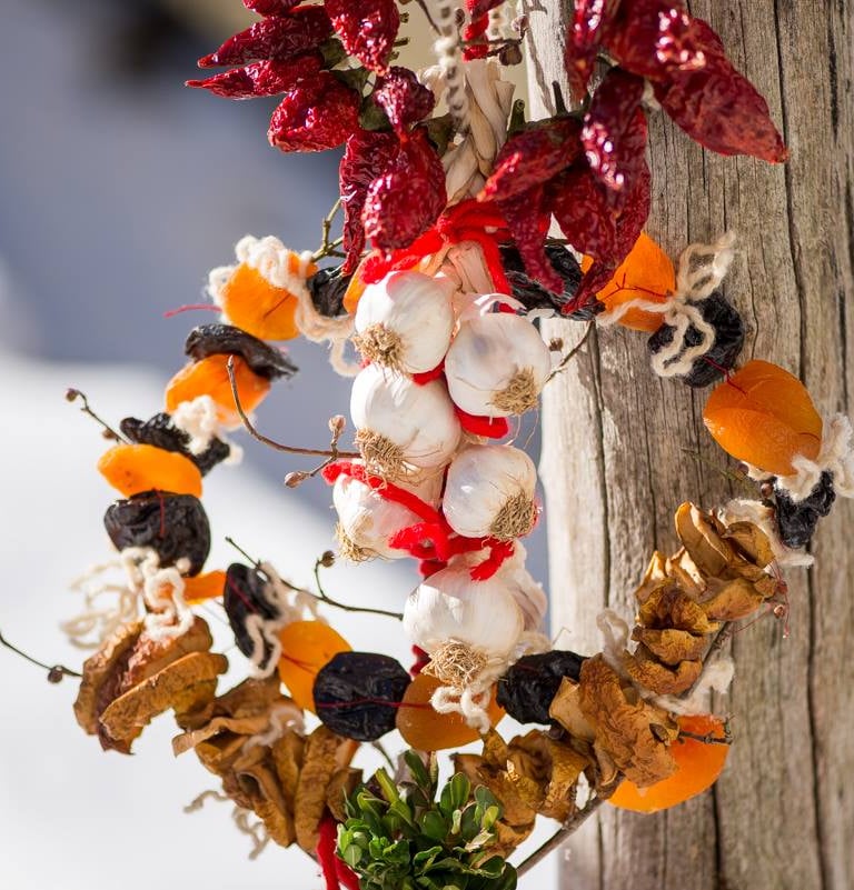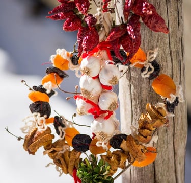 The сурвачка itself is a central symbol of the ritual. Traditionally made from a cornel tree branch—valued for its hardiness and association with vitality—it is bent into a shape resembling the letter “F” and adorned with пукани царевици (popped corn), сушени плодове (dried fruits), червени конци (red threads), монети (coins), and sometimes small bagels or other symbolic tokens. Each element on the сурвачка represents wishes for abundance, fertility, sweetness in life, and protection against evil spirits. Children recite a rhythmic blessing, often beginning with Сурва, весела година! (Surva, happy year!), while lightly patting the backs of family members and neighbors to pass on the blessing.